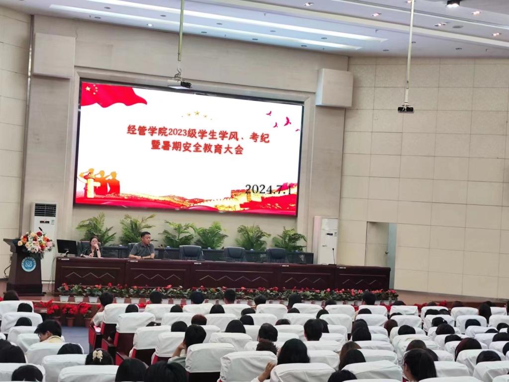 临近期末,为进一步营造良好学风,强化2023级学生考风考纪意识,同时确保每一位学生安全、愉快的度过暑假生活,7月1日晚,必赢766net手机版在图书馆五楼报告厅召开2023级学生学风、考纪暨2024年暑期安全教育大会。必赢766net手机版党总支副书记胡英杰、吴洁辅导员及2023级全体学生参加。